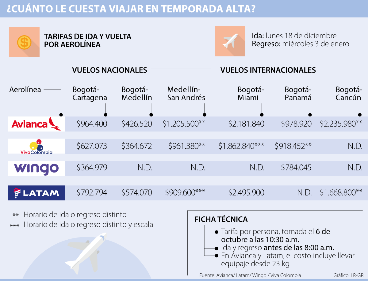 Un consumidor puede pensar dos veces la idea de viajar a final de año si tiene en cuenta el efecto que ha producido el paro de pilotos de Avianca en la industria aérea local, en especial, con el aumento de tarifas. Sin embargo, LR hizo el ejercicio de cotizar viajes nacionales e internacionales, y el resultado es que la temporada alta de diciembre se comportará igual a otras de años anteriores.