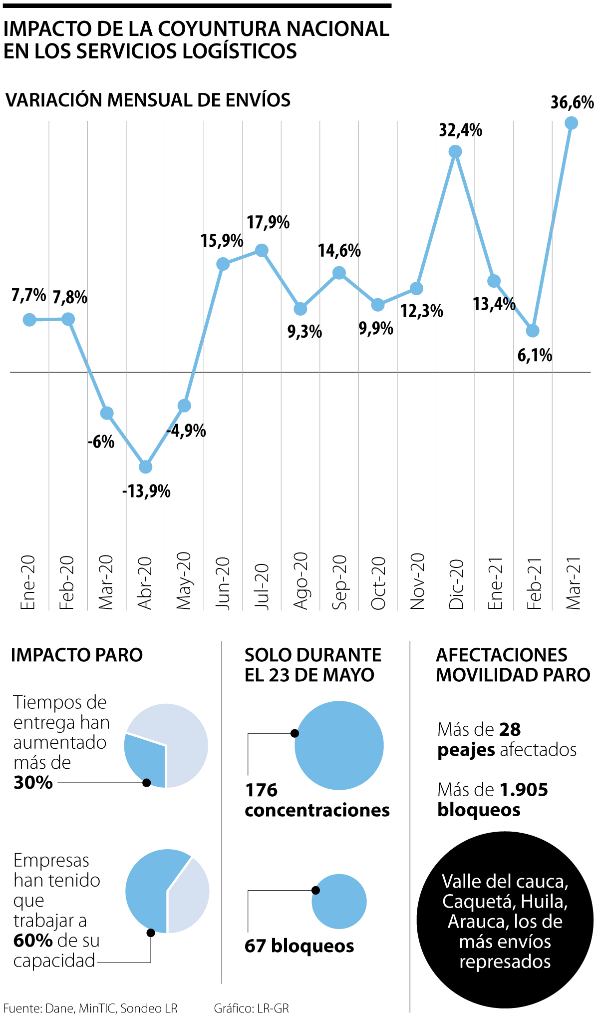 Sin embargo, este comportamiento positivo, que parecía seguir fuerte en marzo de 2021, cuando la variación mensual de envíos llegó a 36,6% y superó la temporada navideña, frenó en seco con el paro nacional.