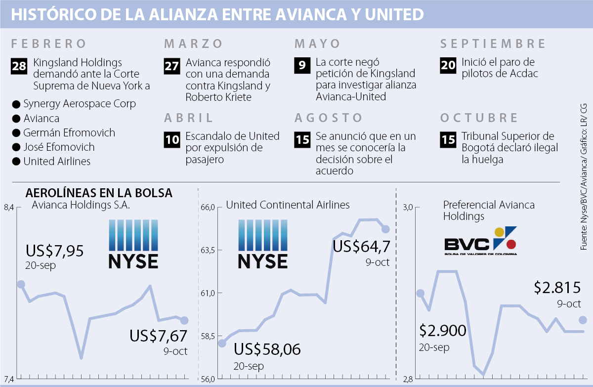 Pero los inconvenientes de esta negociación no empezaron con la huelga, pues el primero de ellos se remonta a finales de febrero cuando Kingsland Holdings demandó ante la Corte Suprema de Nueva York a Synergy, Avianca, Germán Efromovich, José Efromovich y United Airlines tras considerar que se negoció un préstamo por US$800 millones y una asociación en secreto.
