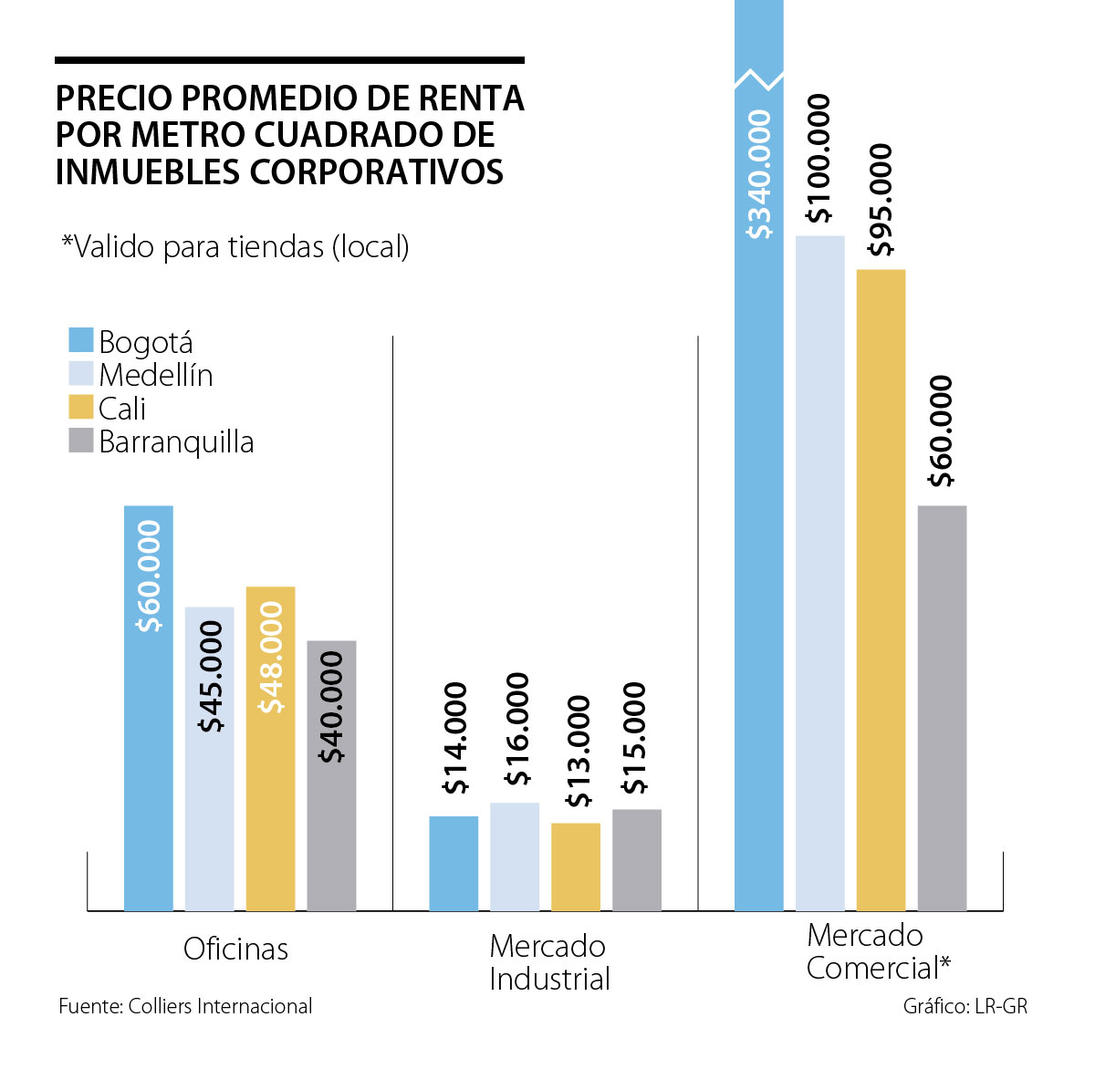 En Colombia hay 3.870.910 metros cuadrados construidos de oficinas, lo que representa 427 edificios. Se espera que para 2019 se construyan seis nuevos inmuebles en Bogotá y otro en Barranquilla.