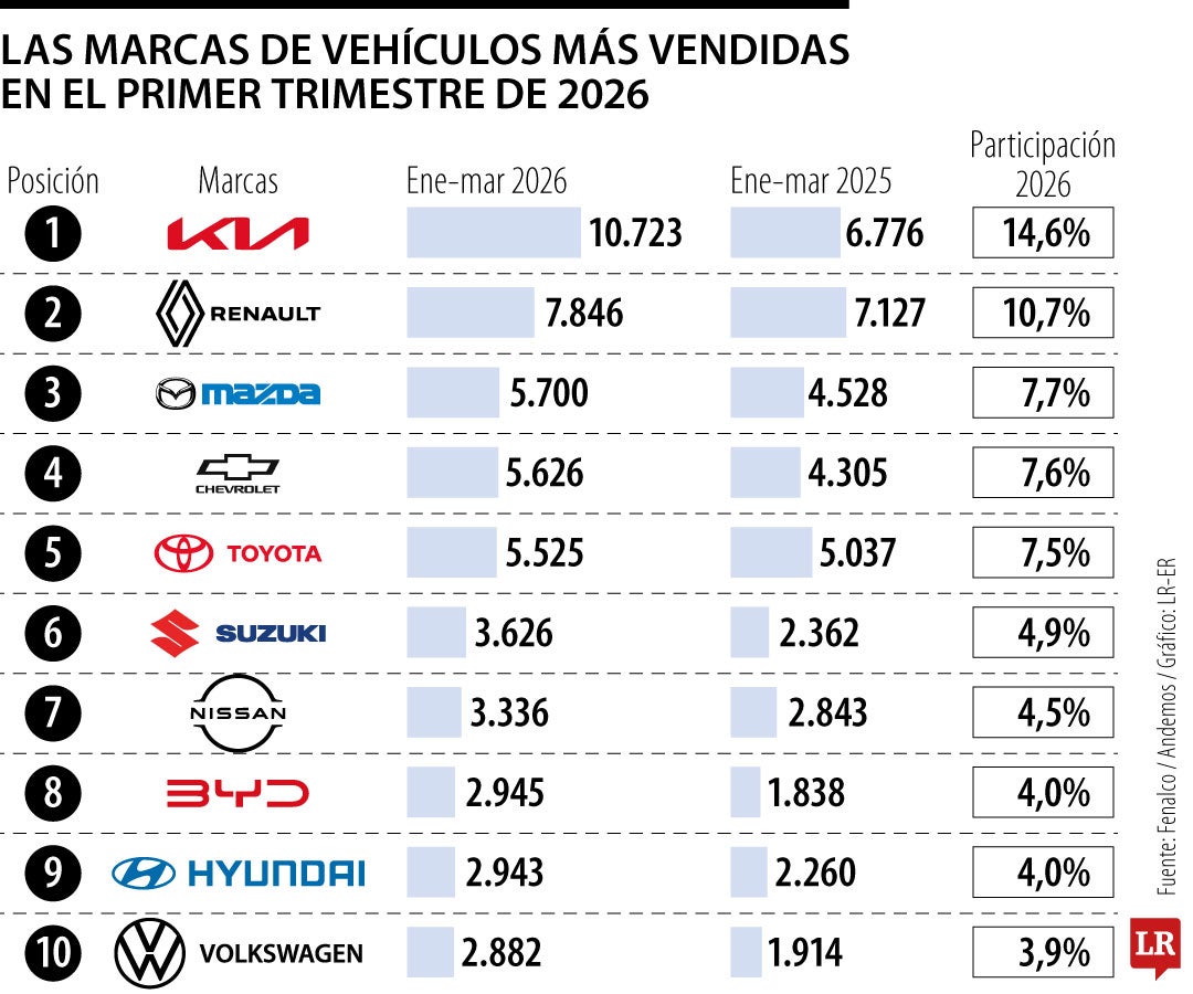 Por su parte, las cinco marcas con mayor número de matrículas en el mes de marzo fueron: Kia, Renault, Tesla, Mazda y Chevrolet con participaciones de mercado en el orden de 14,3%, 9,9%, 8,7%, 7,6% y 6,7% representando 47,3% del total de vehículos matriculados en el tercer mes del año 2026.