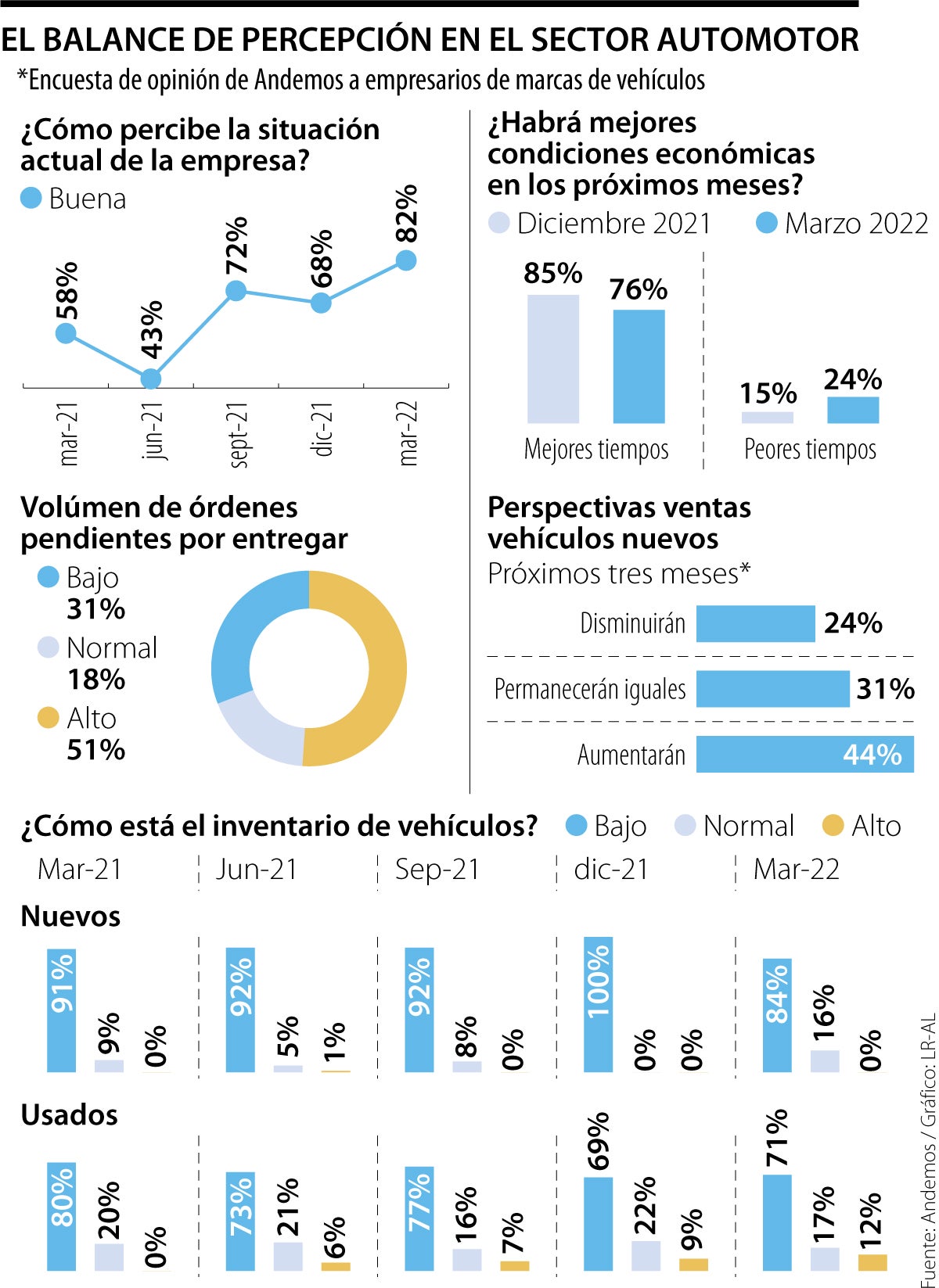 En otra órbita, con la cadena de suministro global aún afectada, la mayoría de los empresarios indicó (84%) que estuvieron operando en estos tres primeros meses del año con un bajo inventario, por la crisis que ha afectado la fabricación de vehículos nuevos. Sin embargo, el número de marcas que reportaron baja en su stock disminuyó 16 puntos porcentuales, pues en diciembre de 2021 habían sido 100% las compañías de ventas de vehículos que operan en Colombia que habían dado este parte negativo.