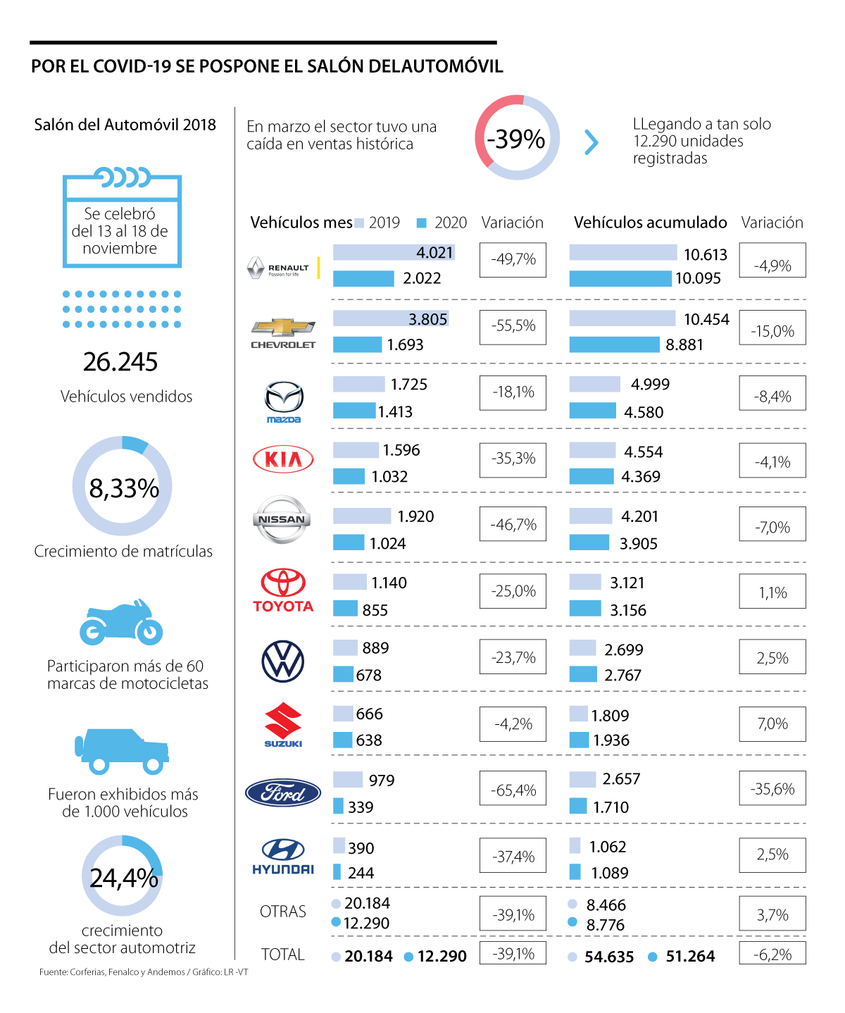 La Federación Nacional de Comerciantes (Fenalco), el Centro Internacional de Negocios y Exposiciones (Corferias) y el Comité de Marcas de Vehículos participantes en el Salón del Automóvil anunciaron el miércoles que dada la situación actual del sector se tomó la decisión de posponer el Salón, que estaba programado del 4 al 16 de noviembre del presente año en Bogotá hasta 2021.