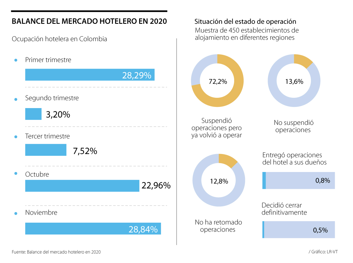 El sector hotelero, uno de los más golpeados por la crisis derivada por la pandemia, terminó 2020 con una lenta recuperación. Según un informe de La Asociación Hotelera y Turística de Colombia (Cotelco) la ocupación se ubicó en 28,84% en noviembre, tras registrar 3,2% en el segundo trimestre del año, y los empresarios esperaban una mejoría en diciembre y enero, sin embargo, esto se retrasará debido a las restricciones de movilidad para contener el segundo pico del nuevo coronavirus.