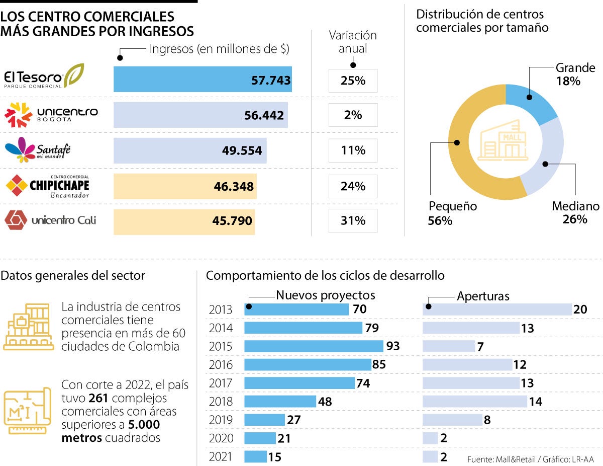 El top cinco lo completan: Santafé Bogotá, con ingresos por $49.554 millones; Chipichape Cali ($46.348 millones); y Unicentro Cali ($45.790 millones); todos lograron aumentar la facturación, en promedio, 19% con respecto a 2023.