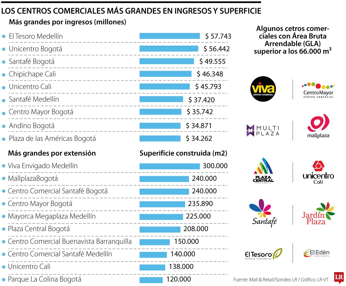 El análisis arrojó también que en Colombia los centros comerciales más grandes se concentran en un grupo con un Área Bruta Arrendable, GLA, superior a los 66.000 metros cuadrados. Entre ellos están Viva Envigado, Centro Mayor, Mallplaza NQS, Unicentro Cali, Plaza Central, Santafé, Jardín Plaza, El Tesoro, El Edén y Parque Fabricato.