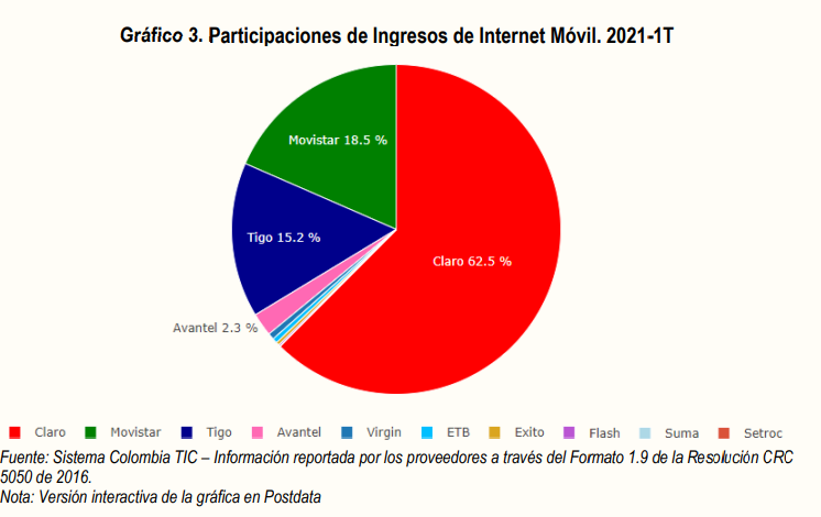 Si se analizan las participaciones de los Operadores Móviles de Red según los ingresos de internet móvil en el primer trimestre, el ranking es el siguiente: Claro (62,5%), Movistar (18,5%), Tigo (15,2%) y Avantel (2,3%).