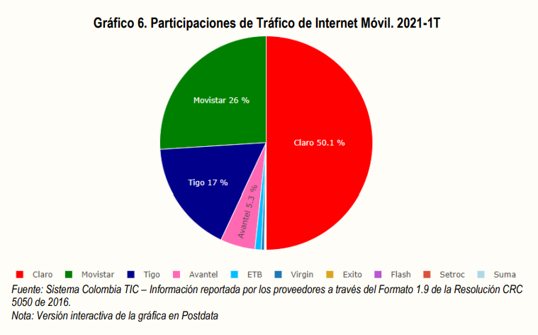 El mismo listado de participación de mercado, pero por tráfico es el siguiente: Claro (50,1%), Movistar (26%), Tigo (17%) y Avantel (5,3%).