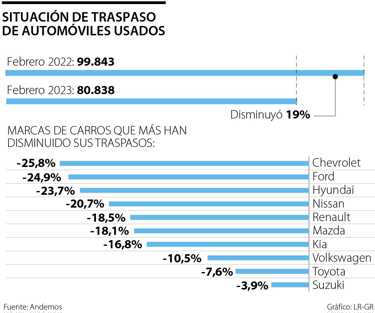 La Asociación Nacional de Movilidad Sostenible (Andemos)presentó un informe en el que reveló que los traspasos de carros usados disminuyeron 19% con respecto a las del año pasado. Esto quiere decir que, en 2022, por estas mismas fechas, se traspasaron 99.843 vehículos, mientras que en 2023 la cifra ascendió a 80.838.