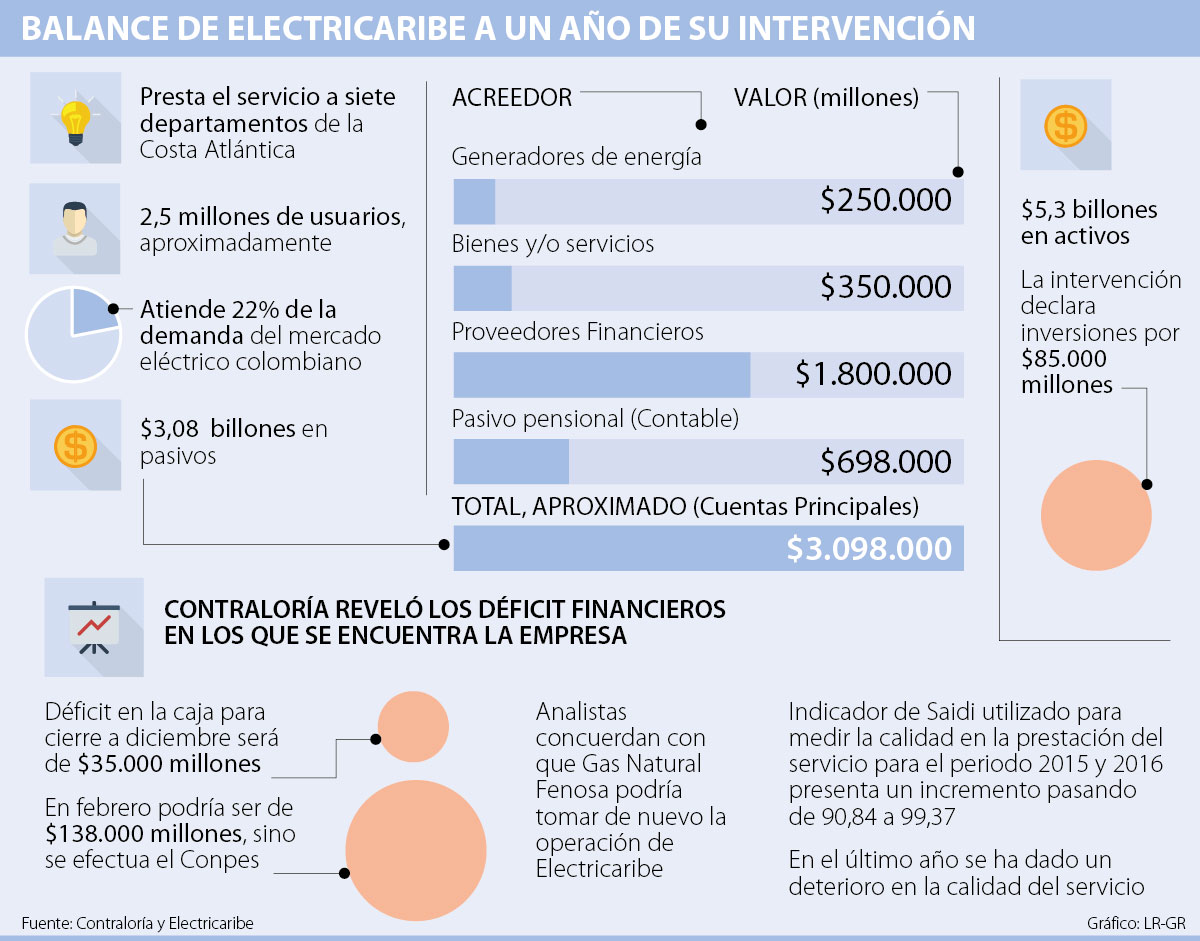 A un año de su intervención el panorama para la Electrificadora del Caribe (Electricaribe) no es nada alentador. De acuerdo con el más reciente informe de la Contraloría General de la República (CGR), al cierre de septiembre la empresa acumuló acreencias por más de $3,09 billones, lo que, en términos generales, prende las alarmas de las posibles amenazas e incertidumbres que se pueden dar en la prestación del servicio.