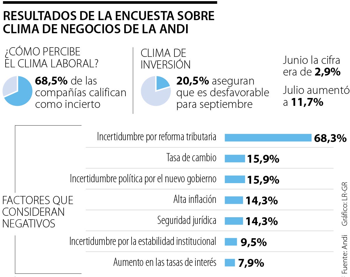 La más reciente encuesta de la Asociación Nacional de Empresarios (Andi) mostró que 68,5% de las compañías califica el clima de los negocios en el país como incierto. Parte de esto se debe al proyecto de ley de reforma tributaria como el principal factor que genera zozobra, con 57,8% de las respuestas.
