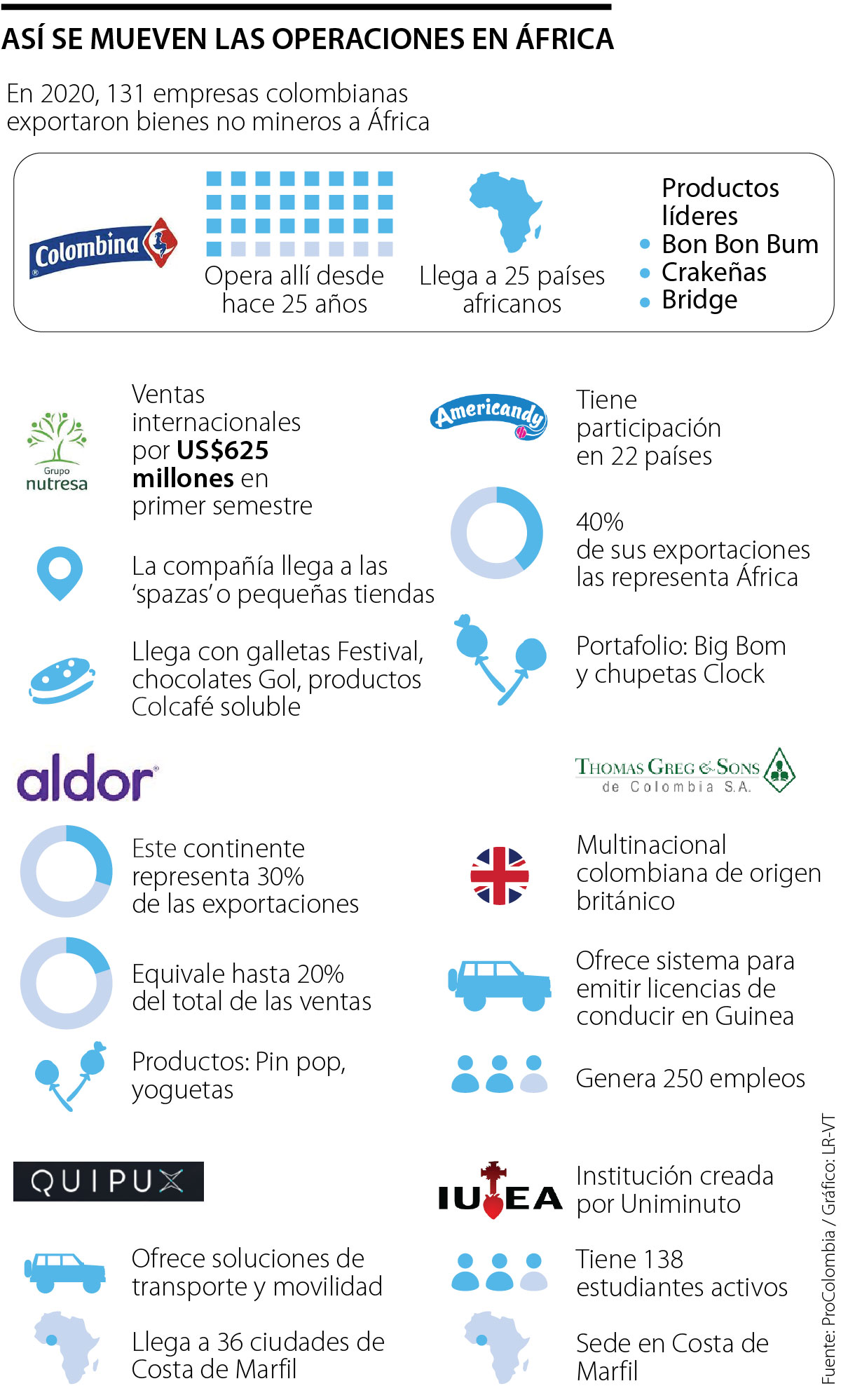 Continuando con la línea de alimentos, para Dulces La Americana, “África alcanza cerca de 40% de las exportaciones, con una participación actual en 22 países de la región”, señaló Eduardo Jaramillo, presidente de la empresa.