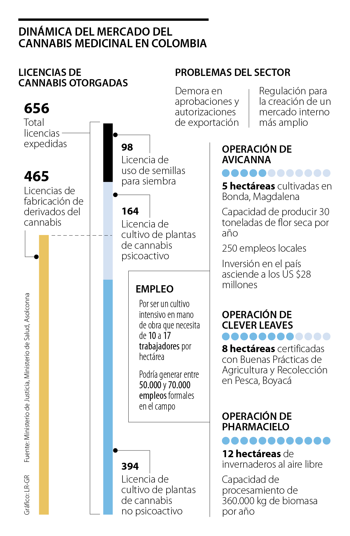 En el caso de Avicanna, la empresa tiene cinco hectáres cultivada en Bonda, Magdalena, con una capacidad de producir 30 toneladas de flor seca por año. La inversión de la empresa en el país asciende a US$28 millones y genera 250 empleos.