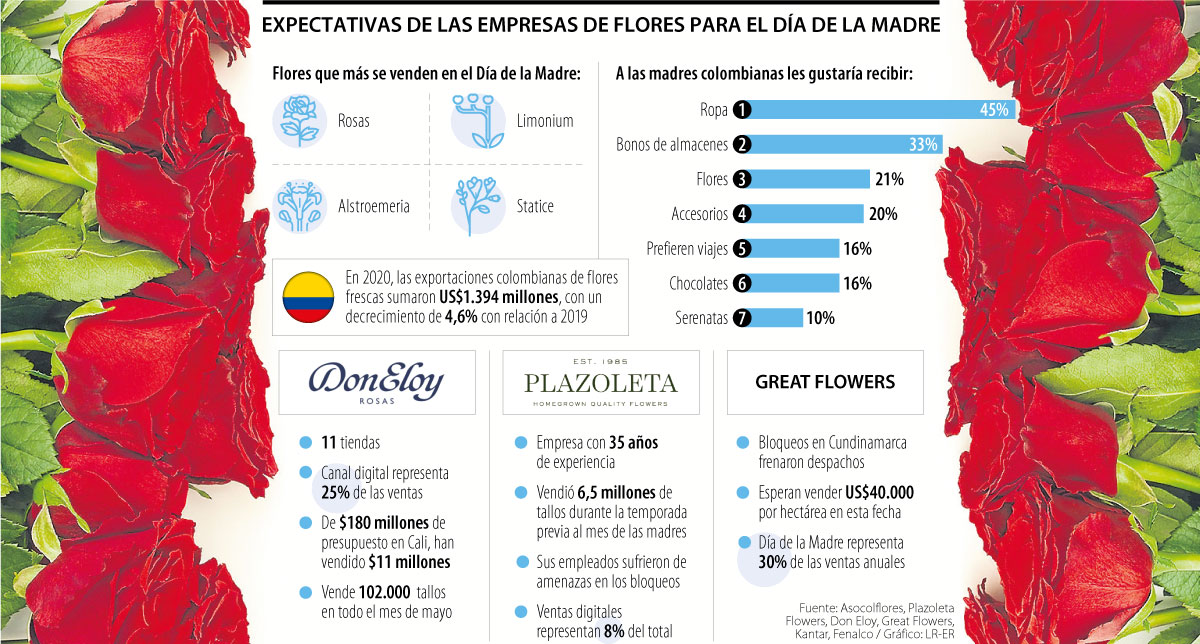 Uno de los sectores que esperan sacar provecho, a pesar de la coyuntura, son las empresas de flores, que aseguran que esta fecha representa 30% de sus ventas anuales, como es el caso de Don Eloy, Great Flowers y Plazoleta Flowers, que se valieron de internet y trochas para rescatar el comercio del mes.