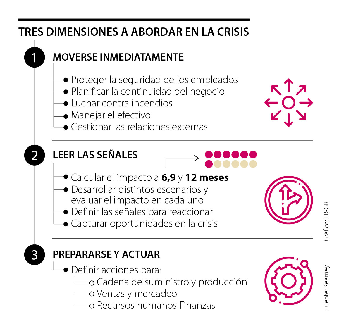 La consultora estableció tres escenarios. Uno, en el que las medidas de los países funcionaron y la crisis se resuelve en junio de 2020; el segundo, donde pese a que las medidas no funcionaron llegaría un medicamento en 2020, por lo que tocaría prepararse para dos semestres complicados y una recuperación en 2021; y el tercero, donde la recesión es inminente y toca esperar una corrección que llegará después de 18 meses o más. Además, Kearney aconseja actualizar esos planes cada mes.