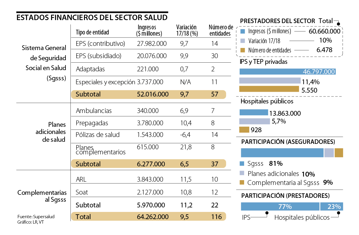En el caso de las entidades aseguradoras del sector salud, los ingresos llegaron a $64,3 billones en 2018, cifra que creció 9,5% frente a 2017. De ese total, 81% viene del Sistema General de Seguridad Social en Salud (Sgsss), 10% a entidades que proveen planes adicionales de salud, y 9% restante a compañías de seguro que ofrecen Soat y ARL. Con respecto a las entidades prestadoras, la cifra llegó a $60,7 billones, que tuvo un alza de 10%. Mientras que los hospitales públicos representaron 23% las IPS y TEP privadas aportaron 77%.