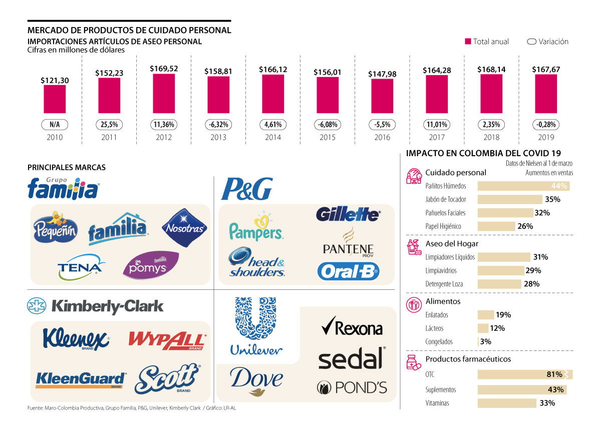 Incluso antes de que se detectara el primer caso en Colombia, en un estudio realizado por Nielsen ya se registraba un aumento de 26% en las compras de papel higiénico, además de otros artículos de cuidado personal como pañitos húmedos, cuyo consumó repuntó 44%, jabones de tocador 35%, y pañitos faciales (32%).