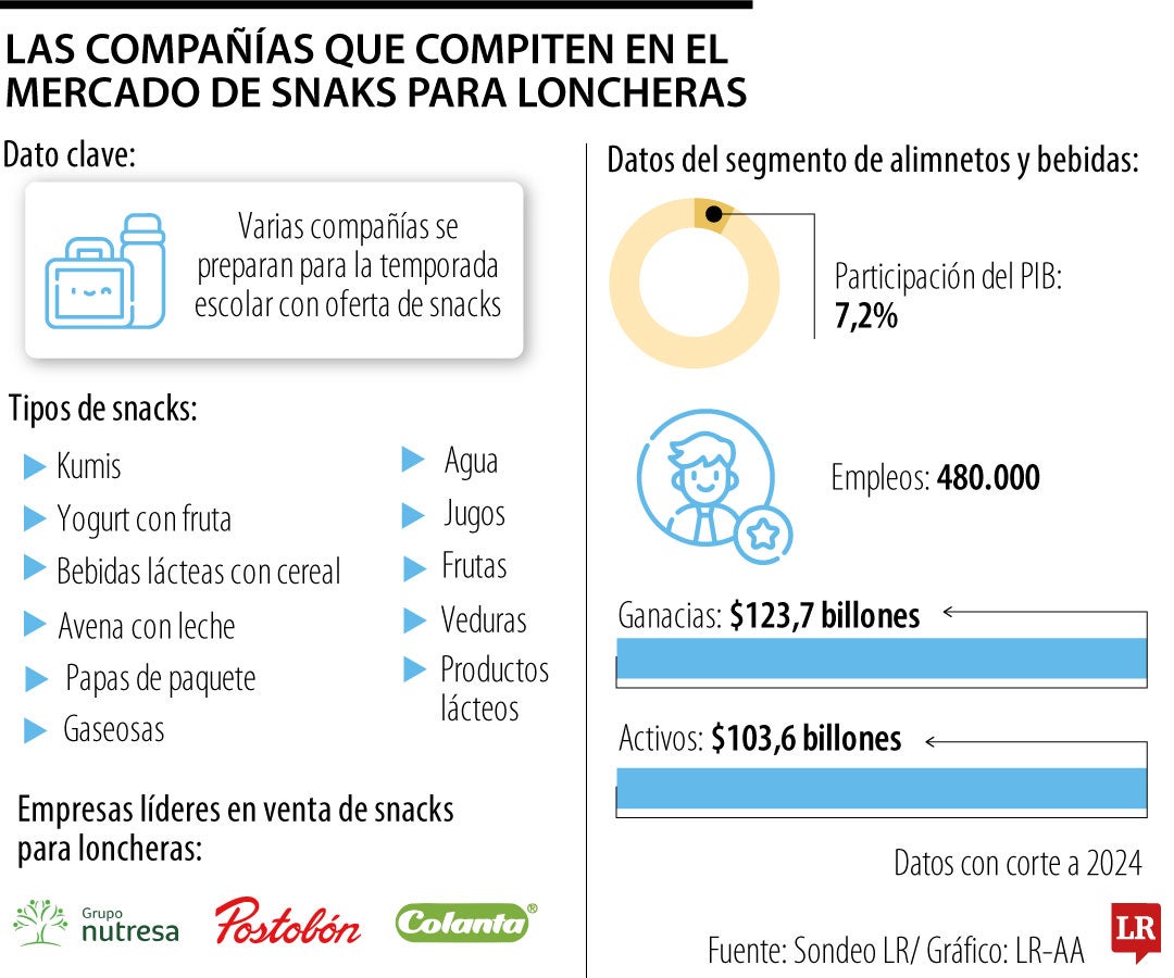 A partir de esta semana, algunos estudiantes retoman sus clases para empezar este nuevo año escolar en el que, además de cuadernos y útiles, los snacks para loncheras destacan en los elementos esenciales para el colegio. Ese es un segmento en el que, si se analizan a los líderes en alimentos y bebidas, de acuerdo con el último informe de la Superintendencia de Sociedades, Nutresa y Postobón llevan la delantera.