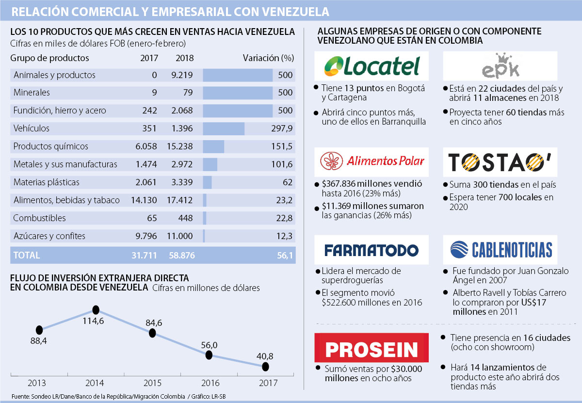 Según cifras del Banco de la República, la inversión extranjera directa desde Venezuela pasó de US$114,6 millones en 2014 a US$40,8 millones en 2017, lo que representó una caída de 181%. Sin embargo, las empresas que lograron establecerse entre mediados de los 90 y comienzos de 2000, hoy reafirman su posición en el mercado y mantiene su expansión.