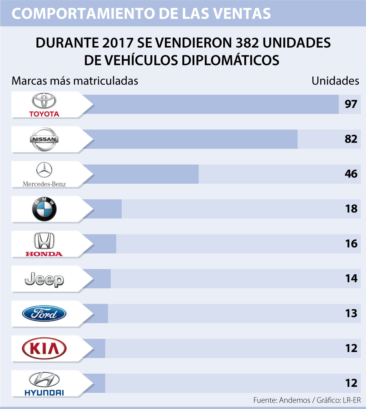 Según el informe Toyota, Nissan, Mercedes Benz, BMW y Honda fueron las marcas que más matrículas recibieron por el Ministerio de Relaciones Exteriores con 97, 82, 46, 18 y 16 unidades respectivamente.