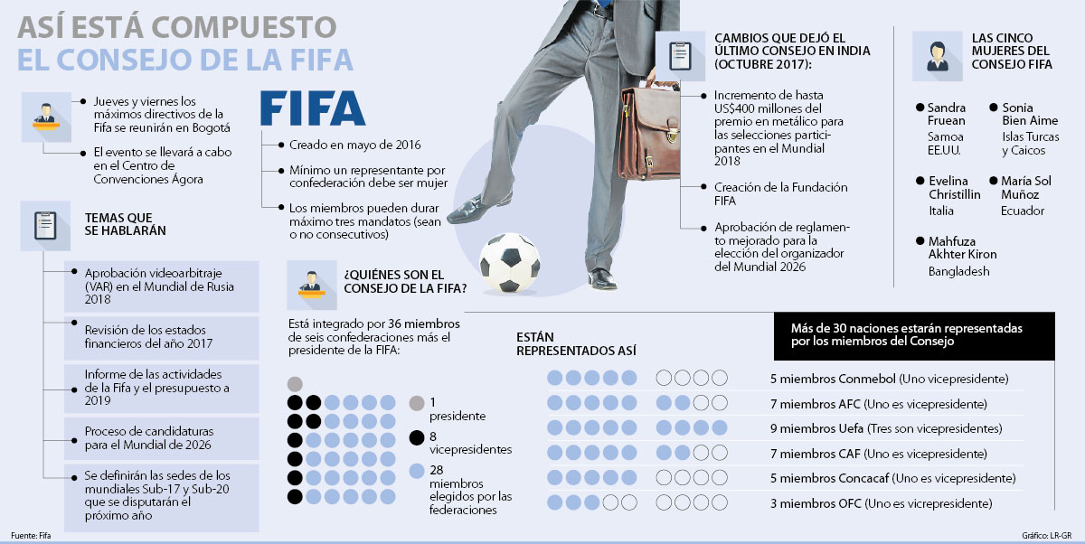 El vocero agregó: “entre las cosas importantes que se discutirán está fijar las reglas para escoger la sede de 2026, tema que se va a decidir en el Congreso Fifa en Rusia en junio”. Entre los miembros del consejo de la Fifa se cuentan ocho vicepresidentes, miembros de las seis diferentes confederaciones, y 28 miembros de las diferentes federaciones nacionales.