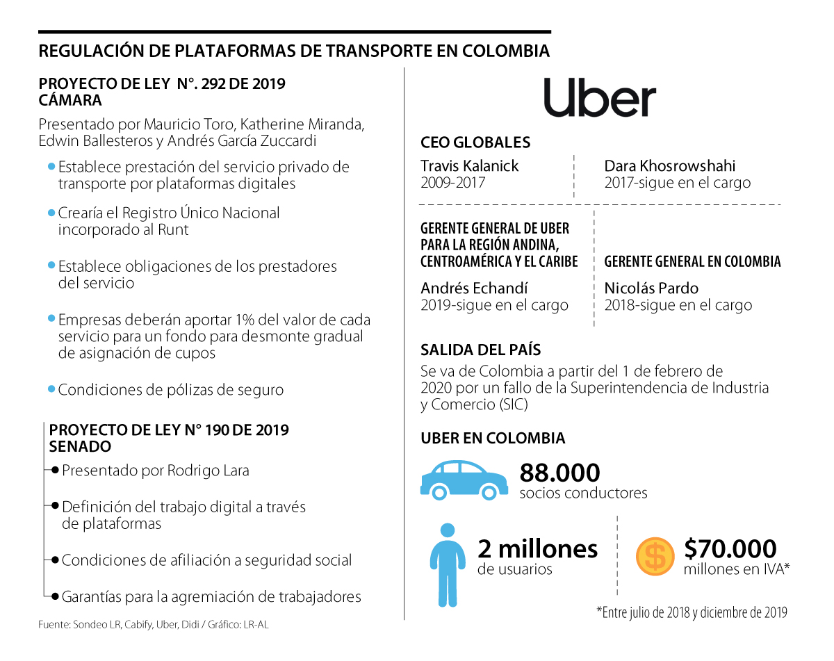 A Uber le quedan 17 días en Colombia, y a pesar de que el Gobierno anunció que trabajará junto al Congreso en una nueva reglamentación de plataformas antes de marzo, la compañía aseguró que si se escoge exclusivamente el camino legislativo, la única aplicación que no operaría en el país sería Uber, que acatando una decisión de la Superindustria, dejará de estar activa el 31 de enero.