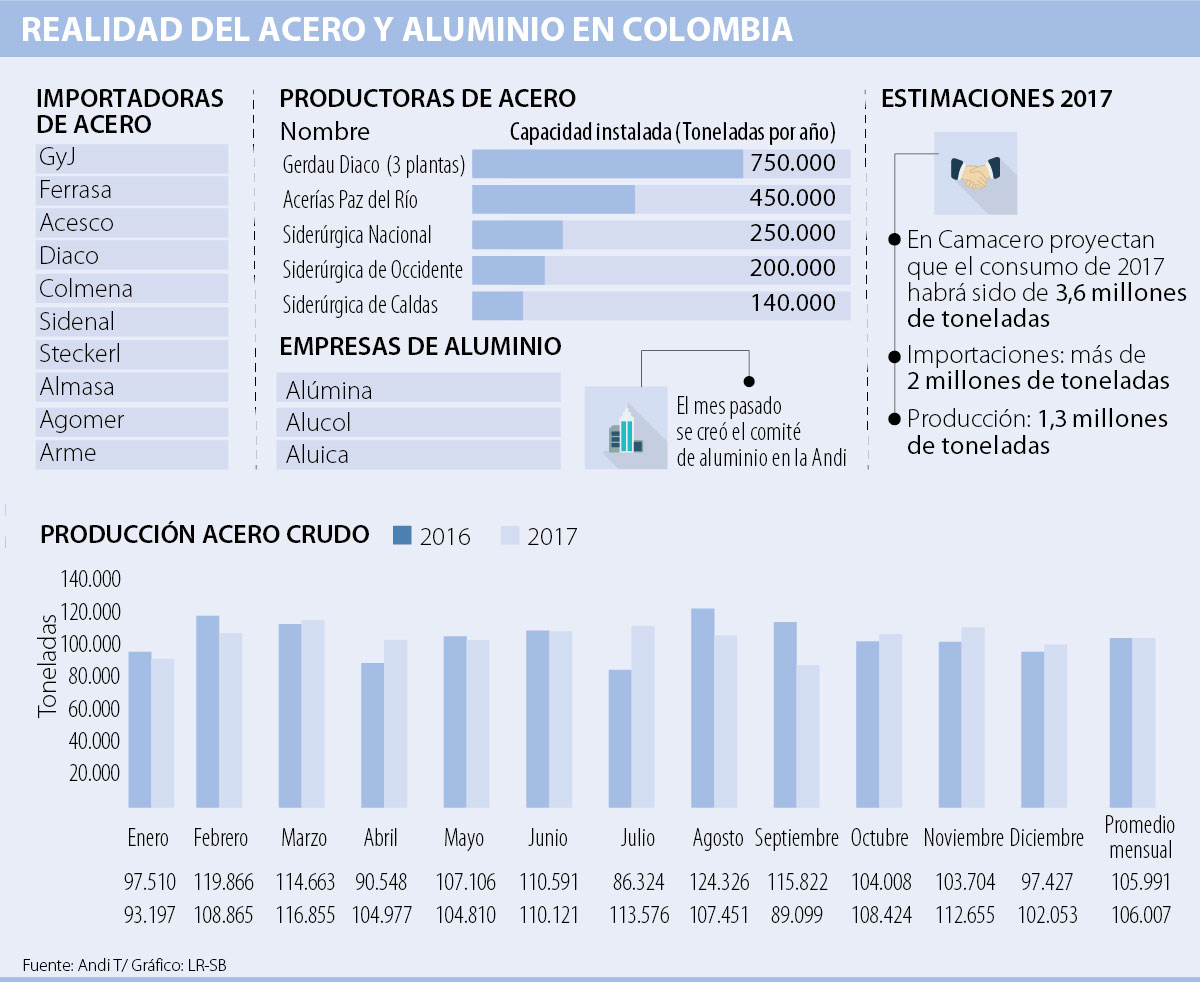 En 2017, según reportes de la industria de metales, hierros y sus derivados, se comercializaron aproximadamente 3,6 millones de toneladas de acero en el país, de las cuales dos millones de toneladas llegaron por importación y tan solo 1,3 millones fueron de producción local.