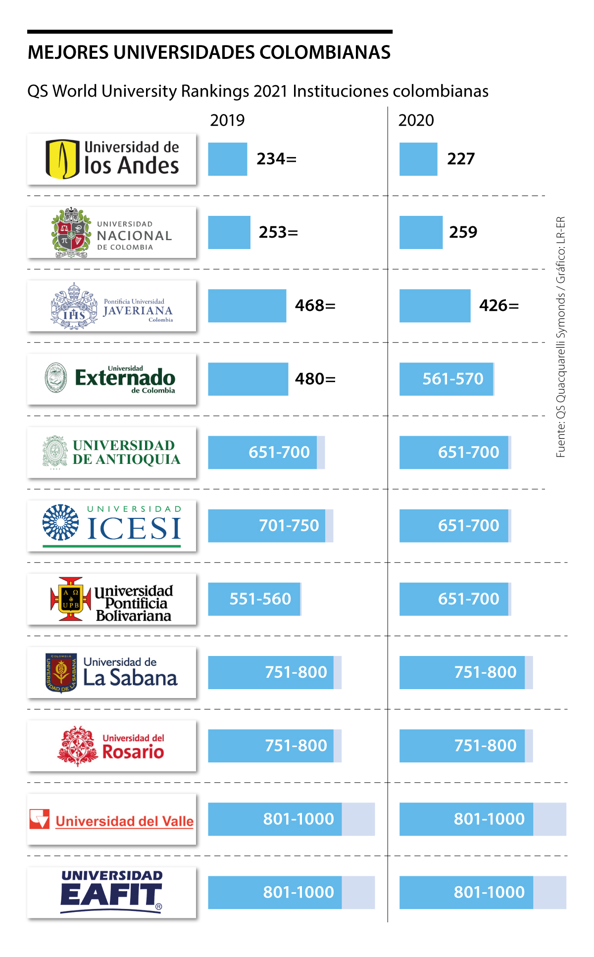 Dentro del listado global, la tercera universidad que figura es la Pontificia Universidad Javeriana, que ascendió a la posición 426, mientras que en 2019 estaba en la 468; seguida por la Universidad Externado, que llegó a la posición 480.