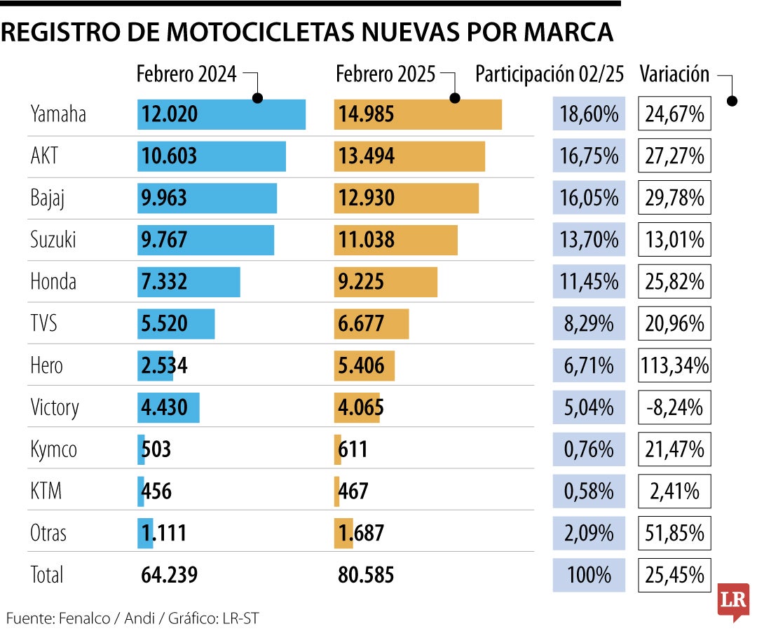En cuanto a las cifras acumuladas, la industria de motocicletas creció 27,9%. Pero comparando los números de enero y febrero de 2025, el registro de nuevas unidades mostró un alza de 9,71%.