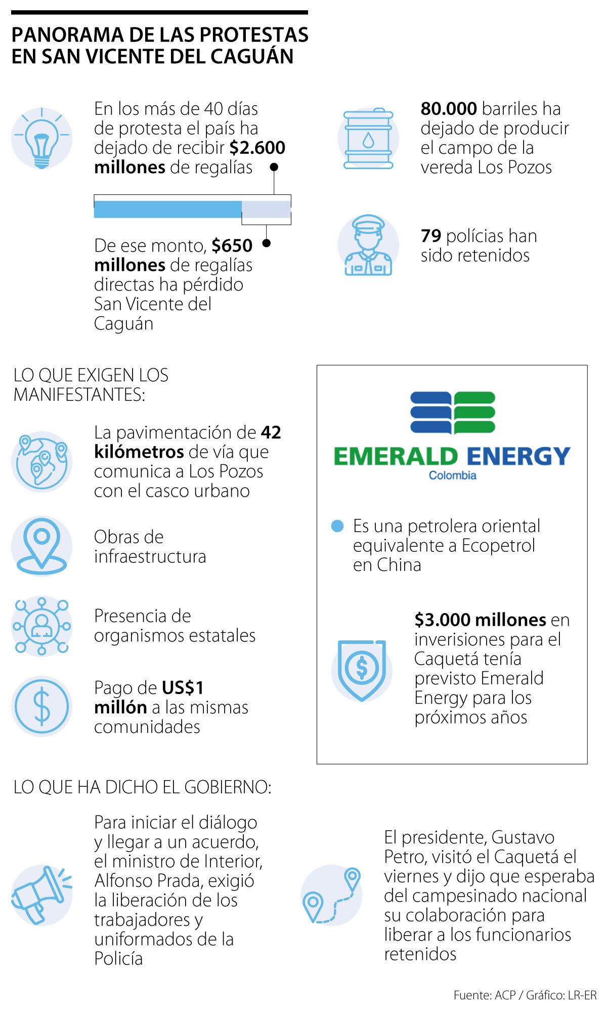 Las protestas en San Vicente del Caguán completan más de 40 días. Los campesinos de la vereda Los Pozos se han movilizado en contra de las instalaciones de la petrolera china Emerald Energy. Hasta ahora, las manifestaciones dejan dos muertos: el policía, Ricardo Arley Monroy y el campesino, Reinel Arévalo.