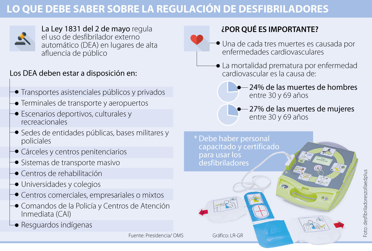 La Ley 1821 del 2 de mayo de 2017 estableció que se debe tener acceso a un desfibrilador externo automático y un encargado de usarlo en transportes de asistencia y en lugares con gran afluencia de público.