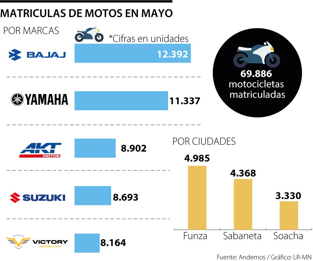 De acuerdo con cifras proporcionadas por el Runt y Andemos, en mayo se matricularon en Colombia 69.886 motocicletas para un total de 356.952 unidades en lo corrido de 2022.