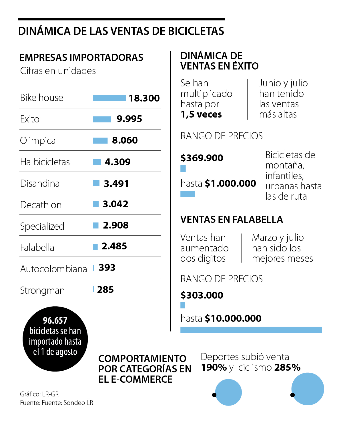 Manuel Duran, director de mercadeo de Specialized Colombia, segunda empresa importadora de bicicletas, indicó que la pandemia tuvo un impacto en la venta durante los dos primeros meses, abril y mayo. En junio y julio, la empresa tuvo un repunte de casi 90%, explicado por la apertura de varios sectores de la economía, así como la flexibilización de las medidas de aislamiento.