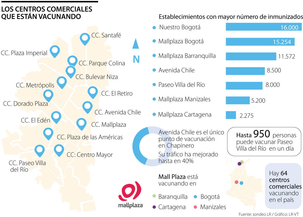 Un cálculo de Acecolombia, el gremio de los centros comerciales, asegura que en todo el país hay 64 malls aplicando vacunas. Según Carlos Hernán Betancourt, presidente del gremio, “hay puestos con capacidad desde 300 hasta 2.000 dosis diarias”.