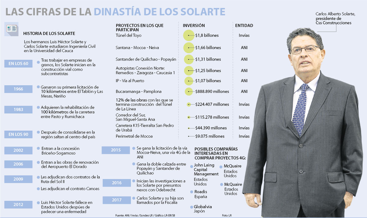 Un funcionario del sector legal resaltó, además, que en este momento los movimientos se darían en las obras 4G, porque hay concesionarios que tienen la incertidumbre de que se frenen los proyectos. Sin embargo, el proceso no sería fácil, debido a que como los Solarte cuentan con más de 25% de participación en las iniciativas, se tendría que buscar a una persona jurídica o natural con la misma experiencia.