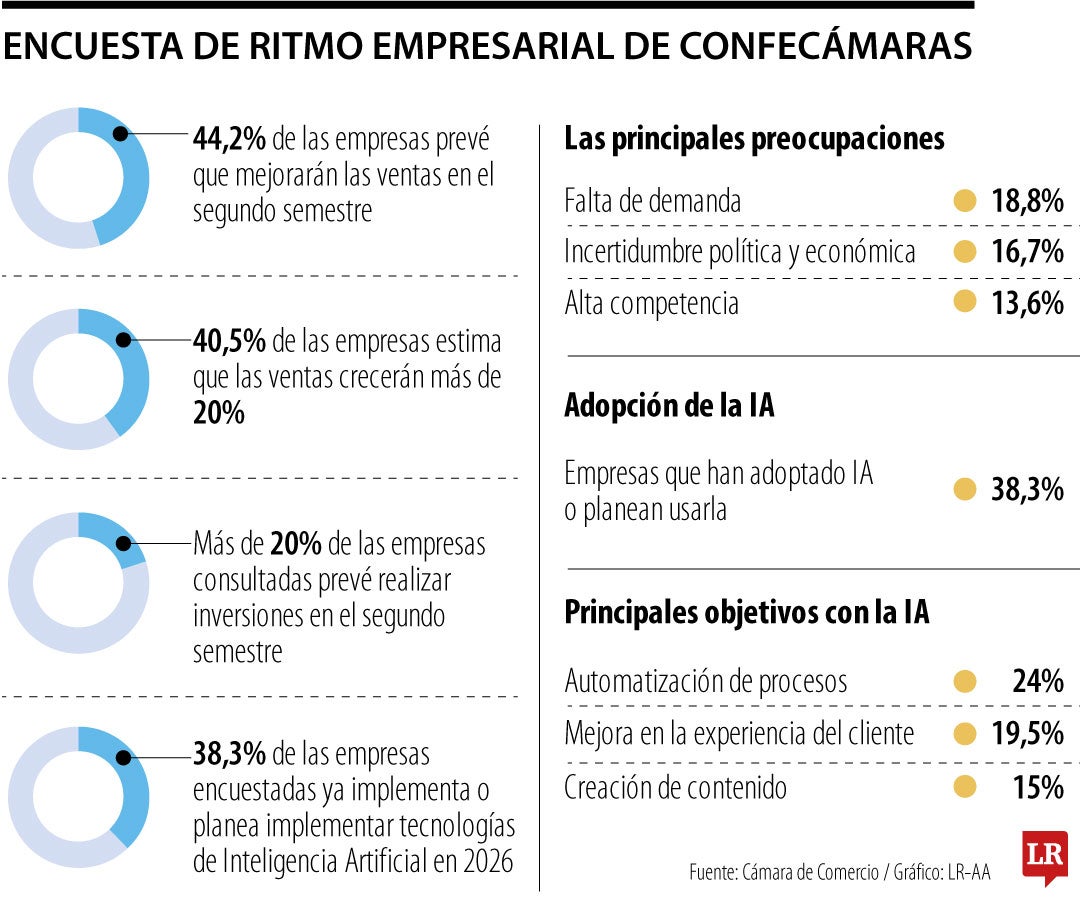 De acuerdo con la más reciente Encuesta Ritmo Empresarial, aplicada por 22 cámaras de comercio, 44,2% de las unidades productivas consultadas prevé un aumento de ventas para el segundo semestre del año y 40,5% de las consultadas estima que ese incremento superará una tasa de 20%.