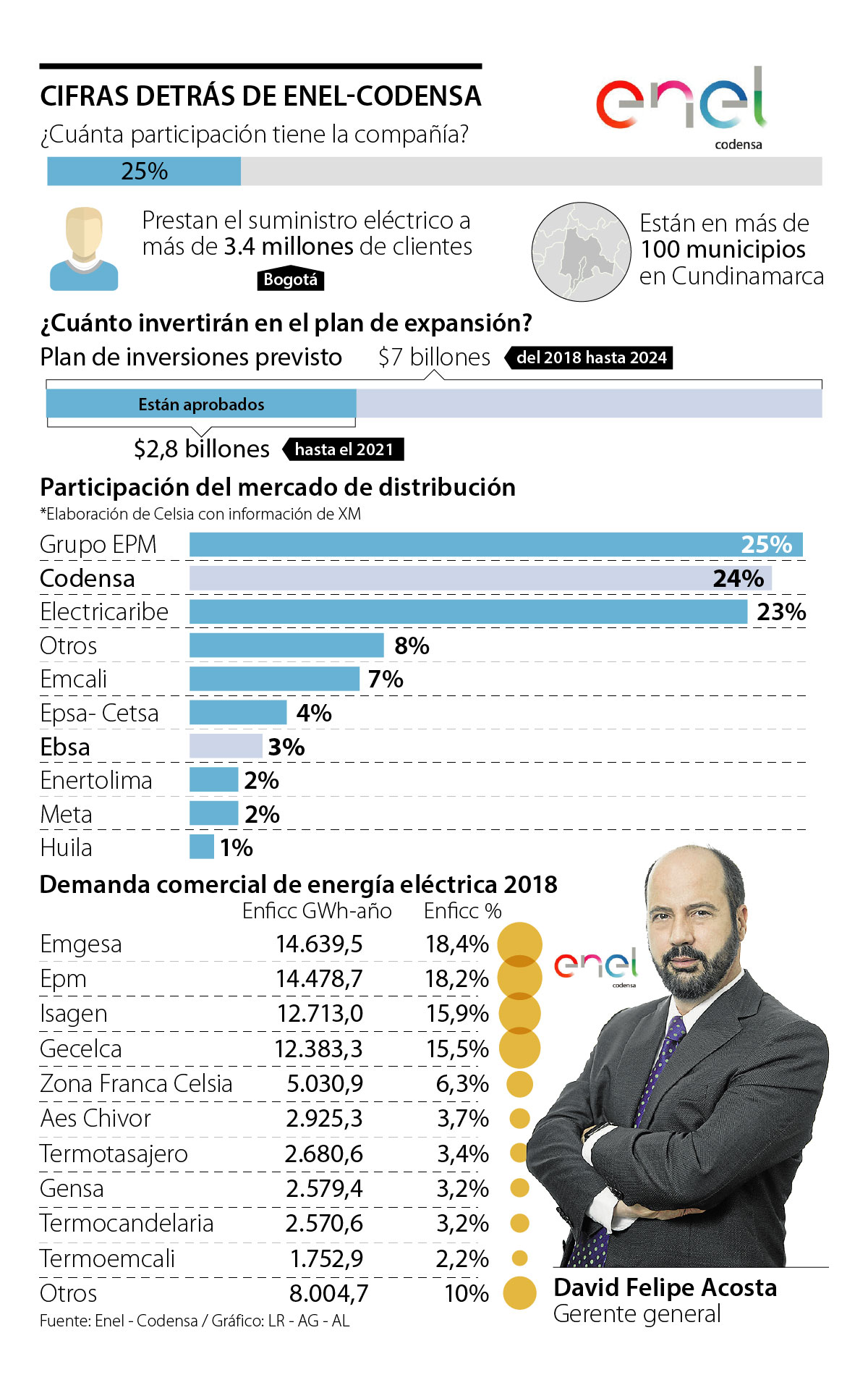 Enel-Codensa tiene casi 20% del mercado de generación de energía y 25% en comercialización, lo que significa que presta suministro eléctrico a más de 3,4 millones de clientes en Bogotá y más de 100 municipios en Cundinamarca. Con el fin de continuar con ese liderazgo, Enel-Codensa dio a conocer su nuevo plan de expansión que tiene “previsto una inversión cercana a los $7 billones del 2018 hasta 2024”, explicó David Felipe Acosta, gerente general de Enel-Codensa, quien agregó que de este total la empresa ya tiene aprobado $2,8 billones hasta 2021.