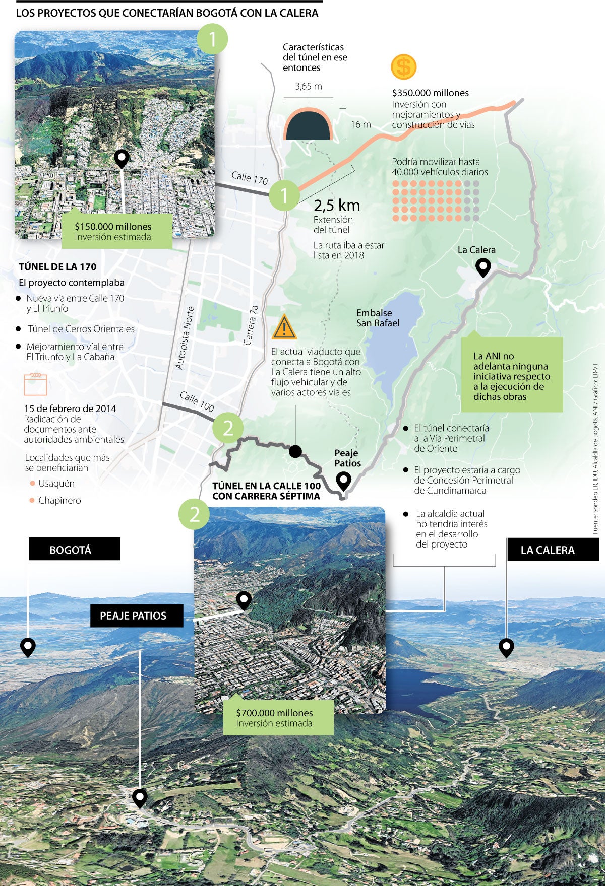 Como varias de las obras que se anuncian y no se entregan. Así quedó la realización del túnel que pretendía ser la alternativa de movilidad entre Bogotá y el municipio de La Calera, cuyos diseños definitivos y monto de inversión ($350.000 millones) fueron anunciados en 2014 por parte de la ANI.