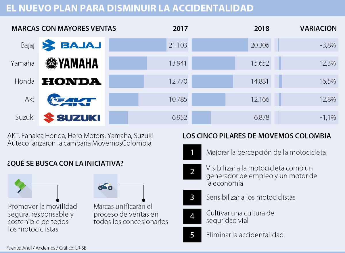 La alta tasa de accidentalidad en las motos y el uso irresponsable de este medio de transporte fueron los dos principales factores que motivaron a las ensambladoras de motocicletas (AKT, Auteco, Fanalca Honda, Hero Motors, Yamaha y Suzuki) a lanzar MovemosColombia, una campaña que no solo prevé reducir la tasa de mortalidad, sino también incentivar el desarrollo del sector.