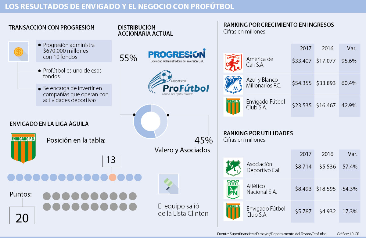 “Esa fue una noticia que coincidió con este proceso y que nos dejó motivados”, explicó Julián Guerra, gerente general de Profútbol (fondo con el que Progresión invierte en empresas que operan con actividades deportivas). “A Envigado llegamos por accidente. Estábamos evaluando la posibilidad de adquirir un equipo en la primera división y fuimos contactados por Valero. Esta era una estructura muy interesante como modelo empresarial, pero inviable para un fondo de capital privado por el asunto de la lista. De la mano de la Ofac y las superintendencias iniciamos el proceso y logramos cerrarlo”, dijo. Guerra confirmó que el monto de la operación es confidencial, pero dijo que se invertirá entre US$5 y US$7 millones en el club.
