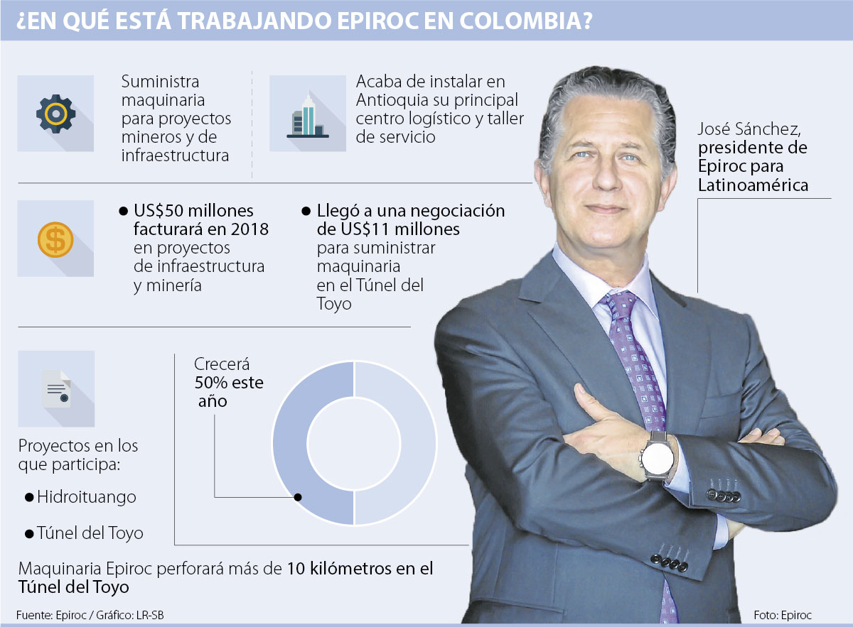 El desarrollo de infraestructura vial en el país fue el principal motivo por el cual la multinacional sueca Epiroc vio oportunidades comerciales en Colombia. Tras lograr la negociación en el proyecto del Túnel del Toyo por US$11 millones para distribuir maquinaria pesada, la empresa prevé que este año será de consolidación y expansión. Al cierre de 2018, espera facturar un poco más de US$50 millones en todos sus proyectos de construcción, minería e hidroeléctricas.