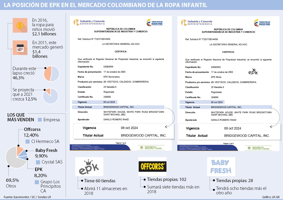 Las posiciones de Bridgewood Capital y EPK Kids Smart se contraponen cuando se habla del propietario de la marca EPK en Colombia. Pero más allá de la titularidad del signo, lo que se pone en juego es quién tiene derecho a explotarlo en el mercado local, lo cual es relevante considerando que EPK es la tercera marca que más vende ropa infantil en el país.