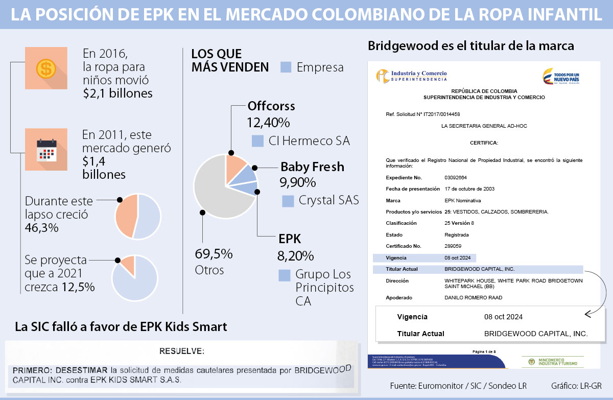 EPK Kids Smart salió invicta de la primera batalla legal que libra contra Bridgewood Capital por la explotación de la marca de ropa infantil EPK. La Superintendencia de Industria y Comercio decidió desestimar la solicitud de Bridgewood para interponer una medida cautelar contra EPK Kids Smart, debido a la falta de pruebas para demostrar que está incurriendo en una infracción marcaria.