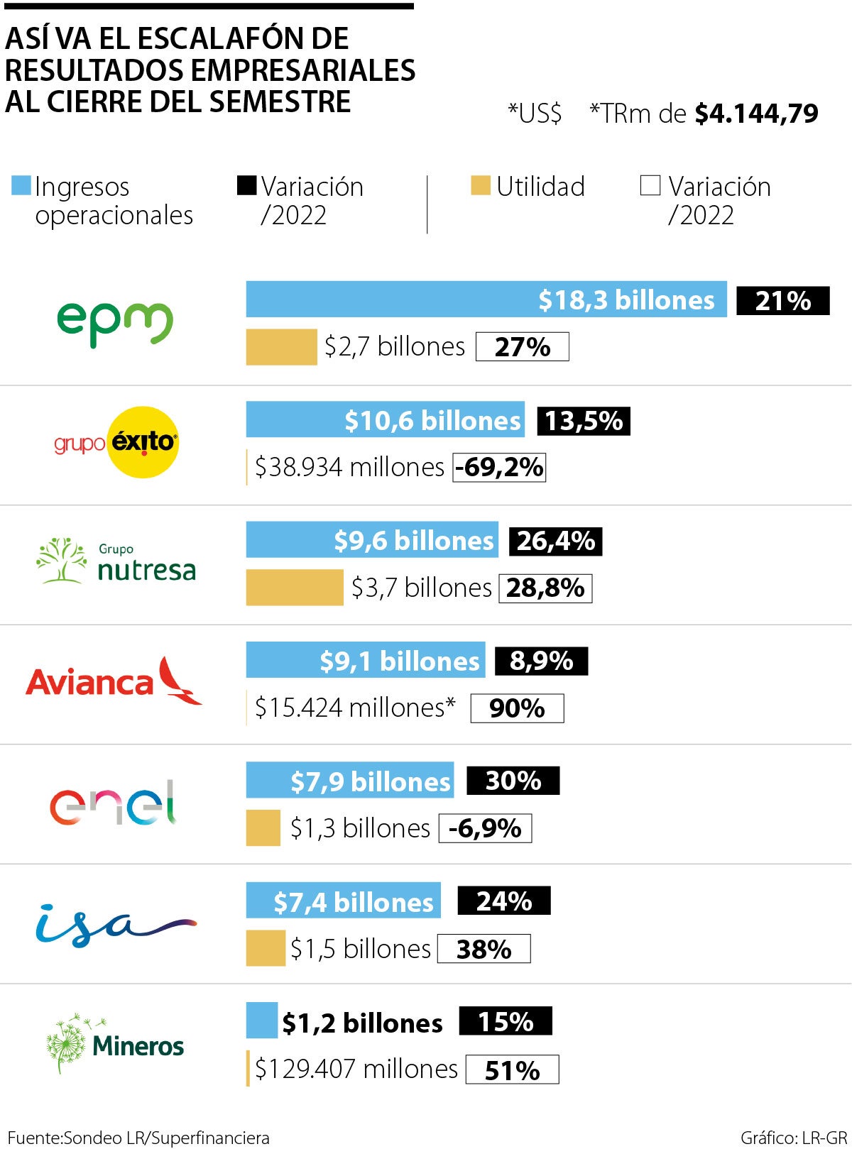 Dentro de la lista de empresas que han reportado resultados, Empresas Públicas de Medellín (EPM) es la líder, con ingresos operacionales por $18,3 billones, lo que representa un incremento de 21% con respecto a 2022. Su utilidad es de $2,7 billones con una variación de 27%.