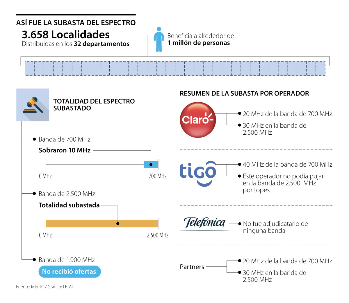 Tras la subasta, Claro se quedó con 20 MHz de la banda de 700 MHz y 30 MHz en la de 2.500; Tigo logró dos bloques (40 MHz) en la banda de 700, donde no tenía participación, pero no pudo pujar en la banda de 2.500 MHz porque excedería los topes permitidos. Partners se quedó con 20 MHz de la banda de 700 MHz y con 30 MHz en la banda de 2.500 MHz (contando el bloque de 10 MHz que busca devolver); mientras que Telefónica Movistar no logró banda.
