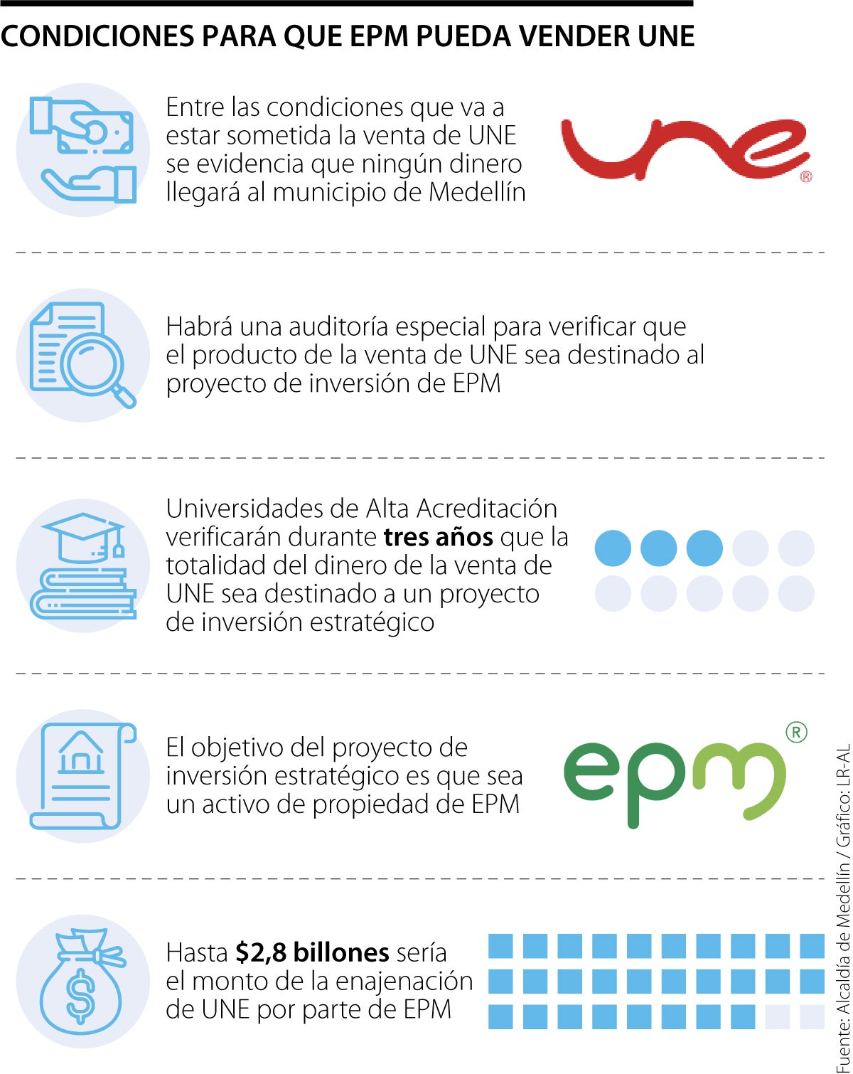 La segunda cláusula de venta es que ninguna suma de dinero que provenga de una eventual venta de UNE , se transfiera a la Alcaldía de Medellín. Una tercera condición es que el objetivo del proyecto de inversión sea un activo de propiedad de EPM, es decir, que esto se dé como un intercambio de activos.