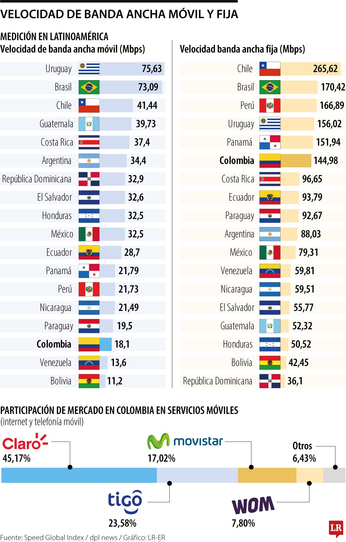 Estimaciones de dpl news, con base en Speed Global Index, arrojó que Colombia es el país número 16 a nivel Latinoamérica en materia de velocidad de banda ancha móvil, la cual es medida en mpbs. El país tiene una velocidad de 18,18 mbps y está solo por encima de Venezuela (13,67) y Bolivia (11,26). Uruguay, Brasil y Chile lideran en la región con velocidades de 75,6, 73,08, y 41,5, respectivamente.