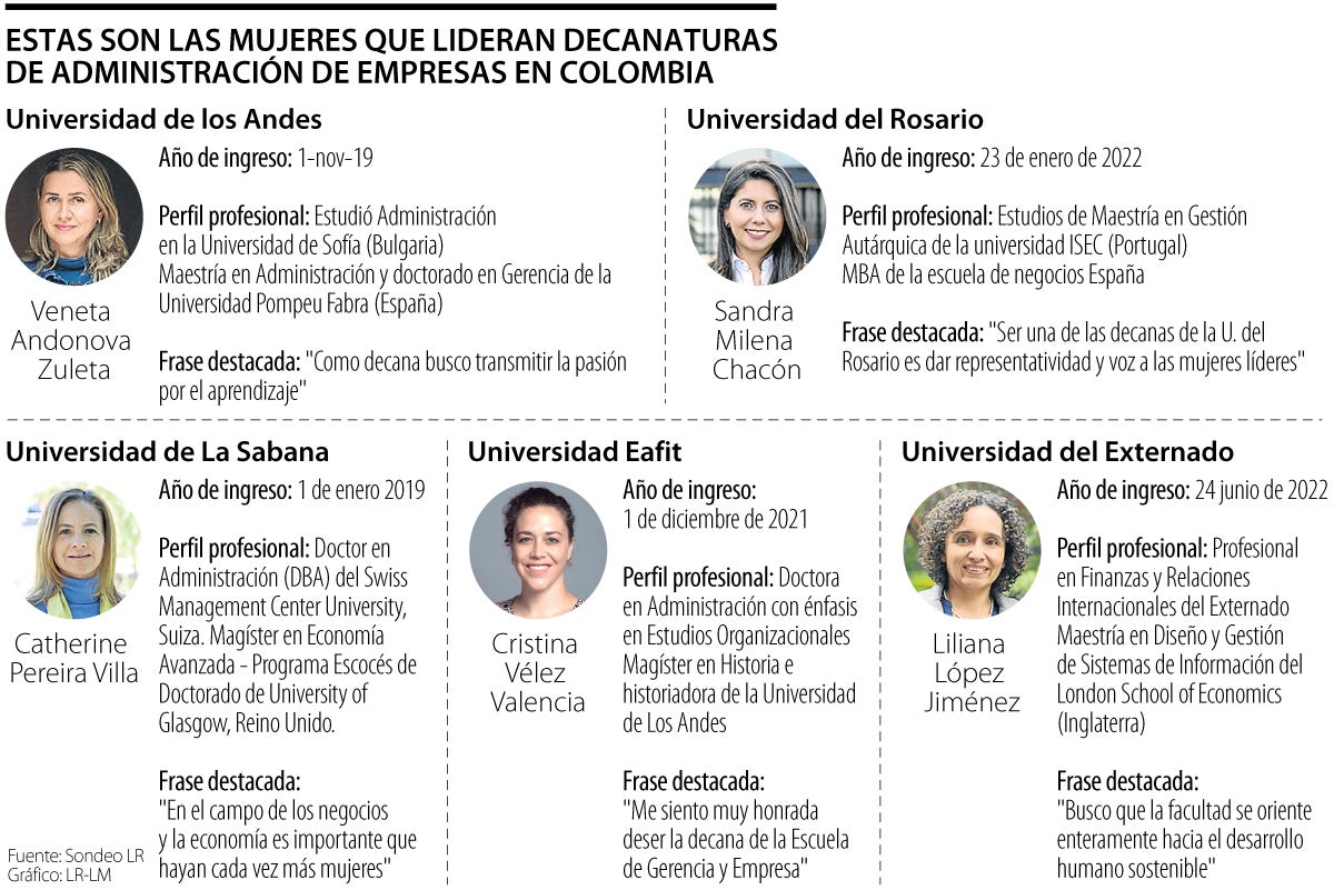 Precisamente, uno de los sectores en donde se ubican esas mujeres líderes y que estarían aportando a la equidad de género es en la academia. En ese sentido, cinco de las principales universidades del país tienen actualmente dentro de sus decanaturas de Administración de Empresas a una mujer en el cargo. Estas son la Universidad de la Sábana, del Externado, del Rosario, de los Andes, y la Eafit.