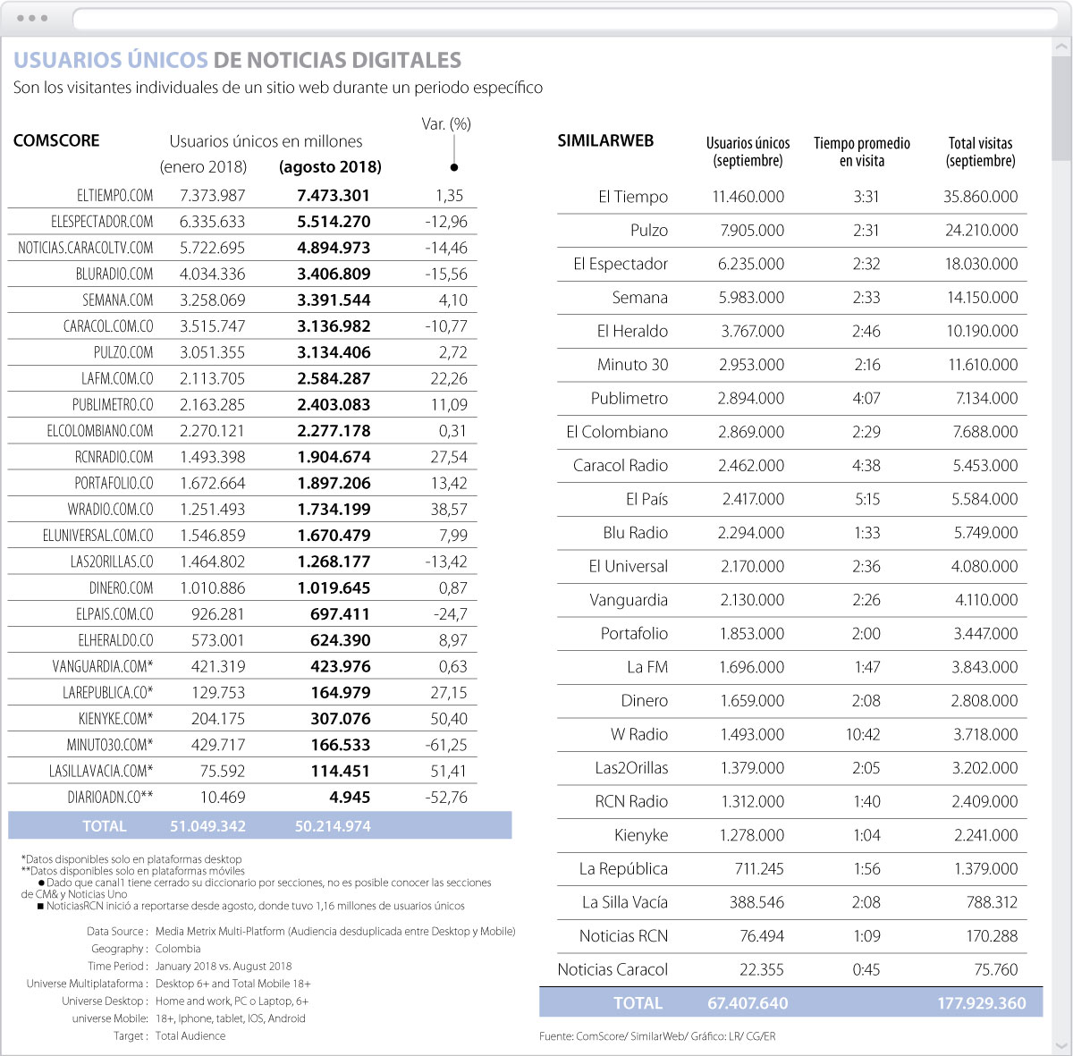Pese a que se tomaron cifras de ComScore y SimilarWEB, los datos previamente mencionados no hacen parte de un estudio directamente hecho por la firma, sino que se tomaron, uno por uno, los medios de comunicación informativos seleccionados por LR.