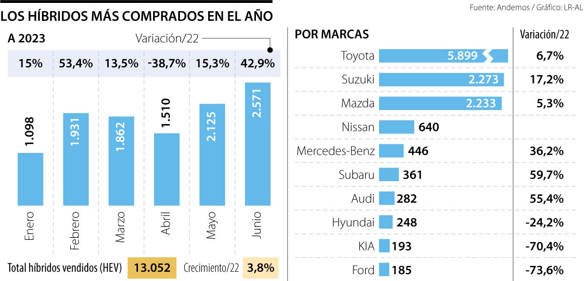 En el ranking, son, según Andemos, Toyota, Suzuki y Mazda, las tres marcas que más están vendiendo híbridos convencionales en el país. La primera ha colocado a rodar un total de 5.899 unidades de vehículos de este segmento en las calles, logrando un crecimiento de 6,7% en lo que va de año.